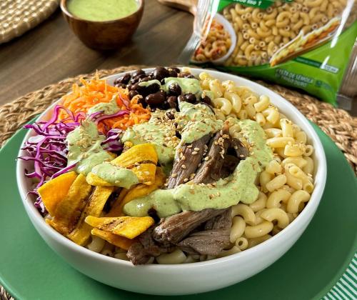 3. En un tazón, mezcla la cebolla morada, el jitomate, el chile serrano y la pasta cocida para preparar el pico de gallo. Adereza con jugo de limón, vinagre, orégano, aceite de oliva, salpimenta.