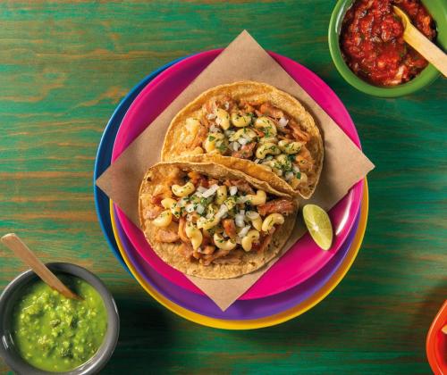 5. Sirve la carne sobre las tortillas, un poco de pasta, la salsa verde cruda, aguacate, cebolla y cilantro.